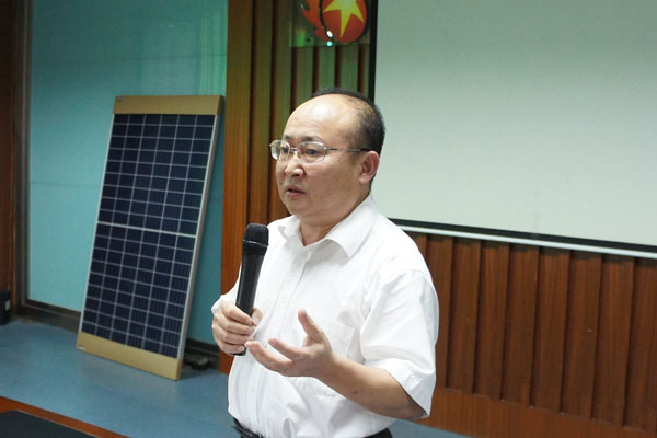 五星公司董事長胡廣良首先與大家分享了國家能源局下發(fā)的《關(guān)于報送整縣(市、區(qū))屋頂分布式光伏開發(fā)試點方案的通知》文件精神。胡董告訴大家,國家能源局文件中已明確,黨政機關(guān)建筑屋頂總面積可安裝光伏發(fā)電比例不低于50%;學(xué)校、醫(yī)院、村委會等公共建筑屋頂總面積可安裝光伏發(fā)電比例不低于40%;工商業(yè)廠房屋頂總面積可安裝光伏發(fā)電比例不低于30%;農(nóng)村居民屋頂總面積可安裝光伏發(fā)電比例不低于20%。光伏迎來了歷史性的大發(fā)展機遇,面對新的機遇和挑戰(zhàn),我們應(yīng)牢牢抓住機遇,迎難而上,憑借自身的技術(shù)、生產(chǎn)、工程、服務(wù)優(yōu)勢,投資建設(shè)出更多、更優(yōu)質(zhì)的光伏電站。