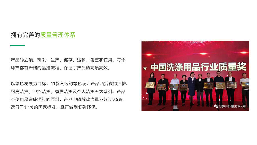 2018年11月,以綠色發(fā)展為目標的41款綠傘產品入選綠色設計產品。這些產品均不使用易造成污染的原料,磷酸鹽含量不超過0.5%,遠低于1.1%的國家標準,真正做到低碳環(huán)保。同年,綠傘榮獲中國洗滌用品工業(yè)協(xié)會頒發(fā)的“中國洗滌用品行業(yè)質量獎”,這一獎項的頒發(fā)充分肯定了綠傘一直以來嚴把質量關、綠色環(huán)保的發(fā)展戰(zhàn)略。