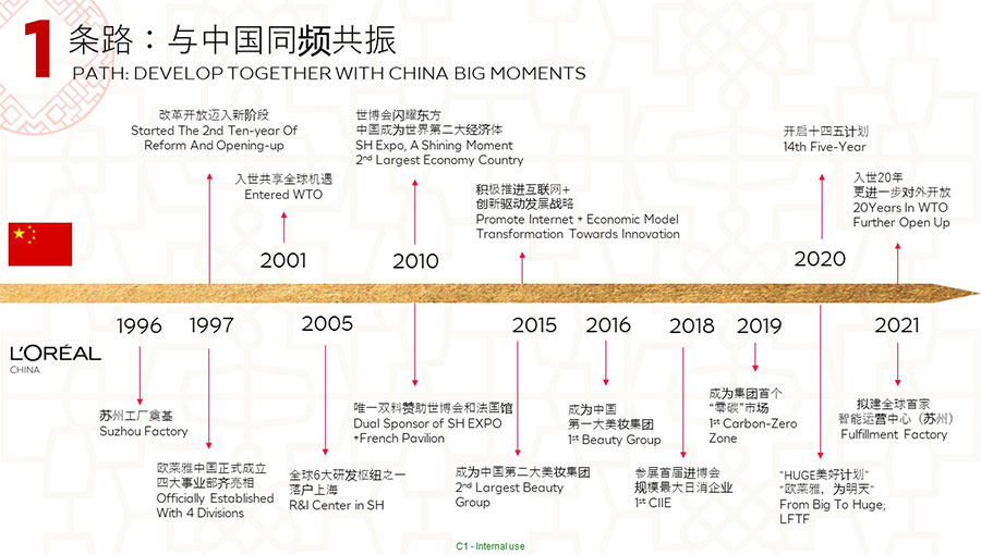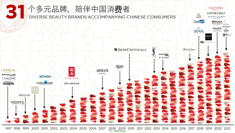 歐萊雅在1997年進入中國。歐萊雅中國的總部位于上海,并在全國設有五個辦事處,目前在中國擁有31個品牌,一個研發(fā)和創(chuàng)新中心,兩家工廠分別位于蘇州和宜昌,共有超過14,000名員工。經過25年高質量、穩(wěn)健、可持續(xù)的增長,中國已成為歐萊雅集團全球第二大市場,該集團北亞區(qū)美妝黃金三角洲的總部,以及該集團美妝科技三大樞紐之一。作為中國最佳企業(yè)公民之一,歐萊雅中國始終貫徹落實該集團提出的“歐萊雅,為明天——可持續(xù)發(fā)展承諾2030”,是該集團第1個完整運營設施“零碳”的市場,并積極通過社會責任項目,持續(xù)貢獻中國社會的美好發(fā)展。
