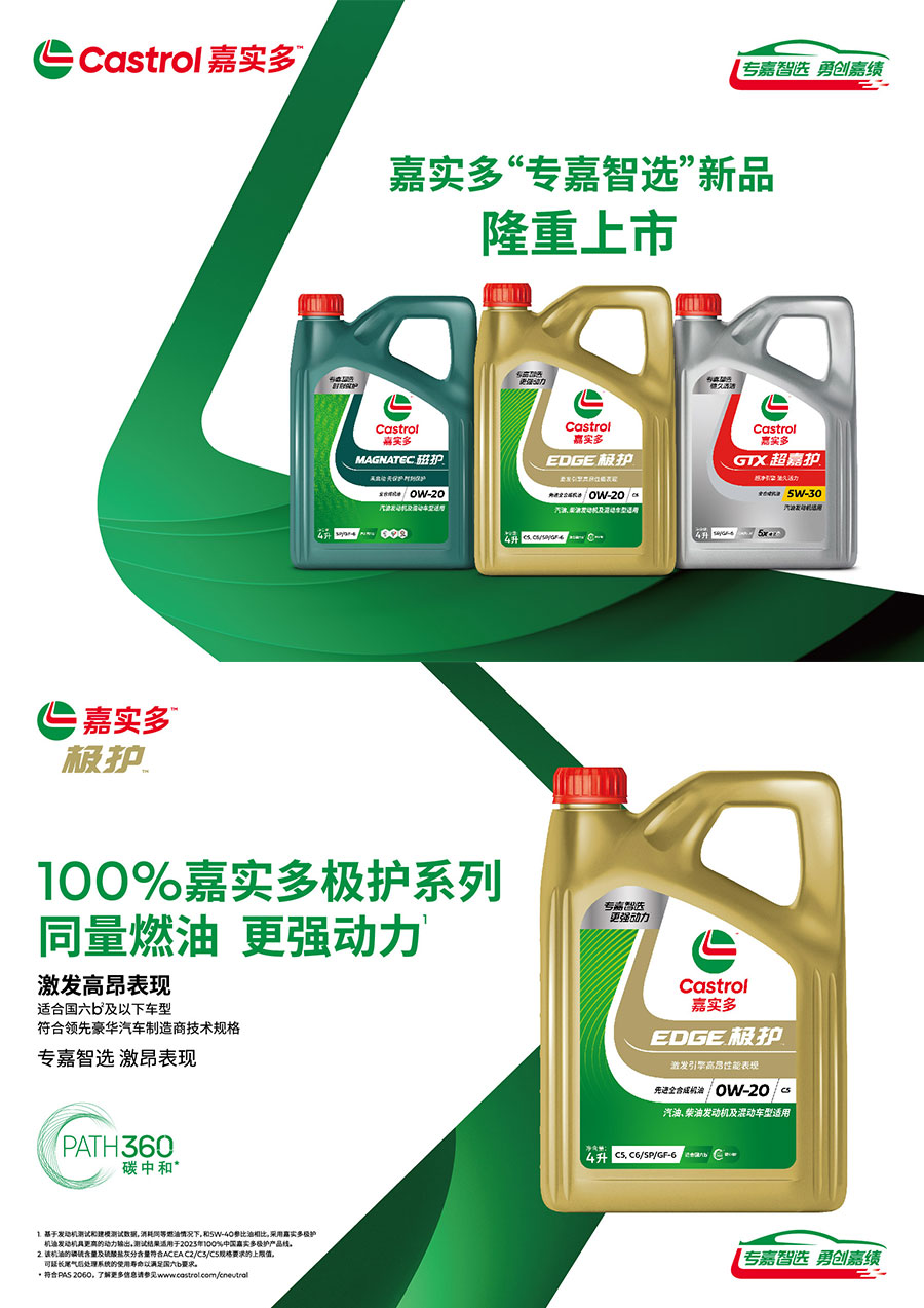嘉實(shí)多是全球領(lǐng)先的潤(rùn)滑油解決方案供應(yīng)商。121年來(lái),嘉實(shí)多始終是品質(zhì)、科技和環(huán)保的先鋒,獲得了全球億萬(wàn)用戶的信賴(lài)。無(wú)論在乘用車(chē)、摩托車(chē)、還是商用車(chē)等領(lǐng)域,嘉實(shí)多都擁有行業(yè)領(lǐng)先的潤(rùn)滑油產(chǎn)品。嘉實(shí)多極護(hù)、嘉實(shí)多磁護(hù)、嘉實(shí)多超嘉護(hù)產(chǎn)品性能全面升級(jí),并且全面適用符合國(guó)六b排放標(biāo)準(zhǔn)的車(chē)型。