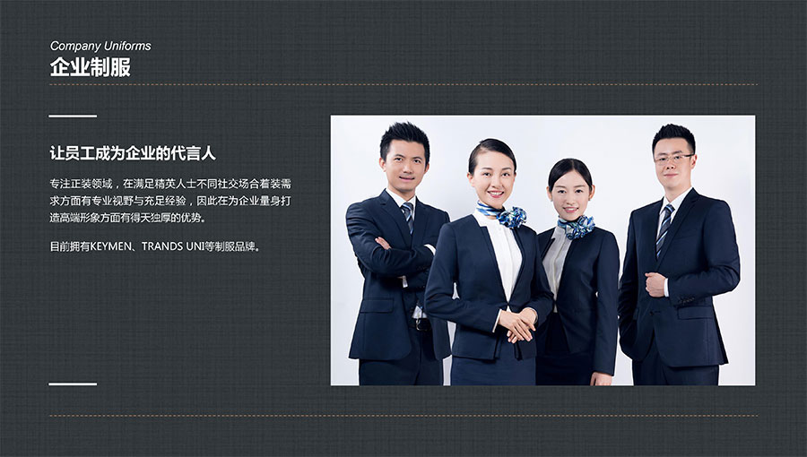 凱門品牌(KEYYMEN):高級職業(yè)裝品牌,企業(yè)形象定制專家。以精湛工藝及最優(yōu)性價(jià)比打造高品質(zhì)、個性時尚的企業(yè)形象,專屬于那些為理想、為事業(yè)打拼,并在成功過程中享受生活的職場團(tuán)隊(duì)及精英人士。