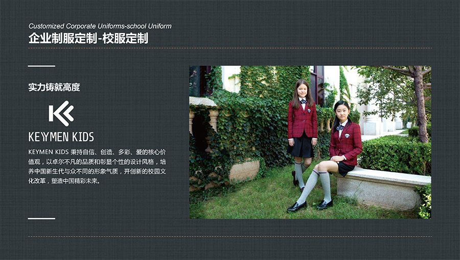 凱門學(xué)生裝(KEYYMEN KIDS):秉持自信、創(chuàng)造、多彩、愛的核心價(jià)值觀,堅(jiān)持“領(lǐng)先一步,步步領(lǐng)先”的品牌理念,致力于打造最具影響力的學(xué)生裝品牌,為中國青少年形象代言,以卓爾不凡的品質(zhì)和彰顯個性的設(shè)計(jì)風(fēng)格,培養(yǎng)中國青少年與眾不同的形象氣質(zhì)。