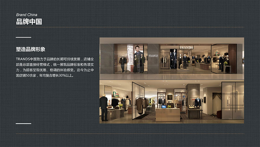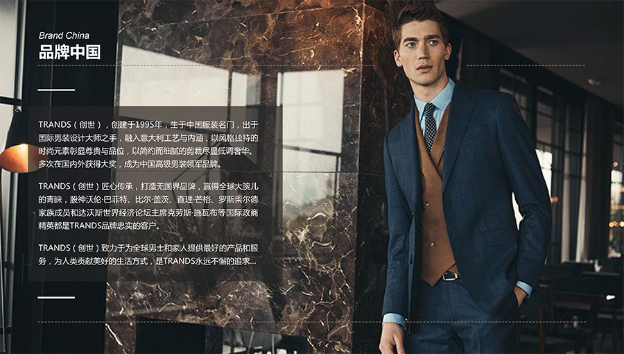 創(chuàng)世品牌(TRANDS):創(chuàng)建于1995年,是當(dāng)今中國高級男裝的代表品牌之一。TRANDS創(chuàng)世成衣產(chǎn)品及量身定制的西裝以其至臻品質(zhì)和精湛工藝,贏得眾多國際政商精英多年來的青睞。
