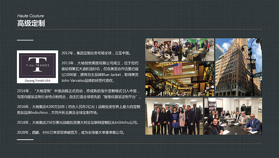 大楊集團(tuán)主要從事生產(chǎn)和銷售各類中高檔服裝產(chǎn)品,以西裝縫制享譽(yù)全球。年服裝綜合生產(chǎn)加工能力1100萬件/套,年西服出口量600萬件/套,年服裝定制產(chǎn)量200萬件/套,連續(xù)多年排名全國第一,是全球重要的西裝生產(chǎn)基地。