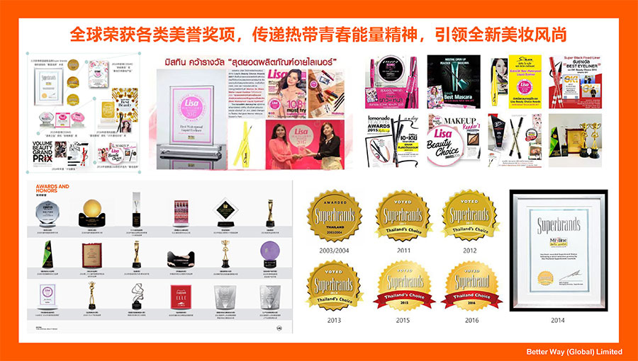 近年來,Mistine蜜絲婷更是先后榮獲ELLE雜志“THAILAND BEAUTY AWARDS”大獎(jiǎng)、中國(guó)化妝品大會(huì)藍(lán)玫獎(jiǎng)「2022年度競(jìng)爭(zhēng)力品牌」、天貓金妝獎(jiǎng)「年度防曬獎(jiǎng)」、快手電商「年度甄選好物獎(jiǎng)」、抖音電商「年度好物獎(jiǎng)小IQF國(guó)際品質(zhì)節(jié)暨消費(fèi)領(lǐng)導(dǎo)力峰會(huì)杰出消費(fèi)影響力品牌」、CAQI中國(guó)質(zhì)量網(wǎng)「全國(guó)美妝行業(yè)質(zhì)量領(lǐng)先品牌」、2023美伊大賞TOP·護(hù)膚類防曬大獎(jiǎng)、2023美伊大賞TOP·彩妝類底妝大獎(jiǎng)等榮譽(yù)。