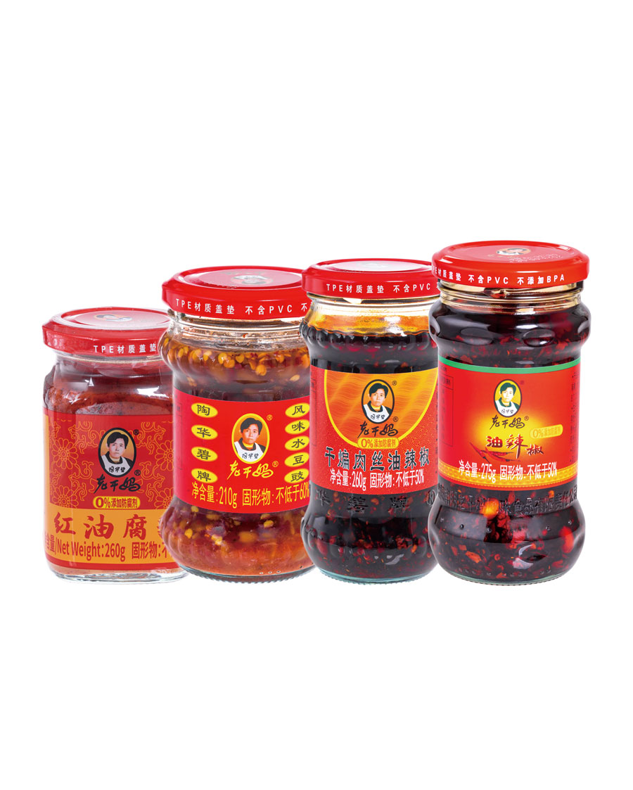 主要產(chǎn)品:老干媽牌油辣椒系列(油辣椒、風味豆豉、香菇、精制牛肉末豆豉、辣三丁、香辣脆、干煸肉絲、風味雞、肉絲豆豉)、火鍋底料(糟辣椒/植物油)、香辣醬、下飯菜、拌飯醬、風味水豆豉、紅油腐乳、風味腐乳、香辣菜、風味糟辣剁椒(中辣/微辣)、姜蒜糟辣剁椒、番茄辣醬