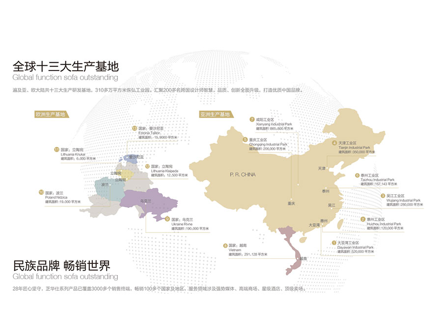 在全球設有多家子公司、分公司及關聯(lián)公司,運營網(wǎng)絡橫跨亞、美、歐、澳四大洲,擁有超過8000個銷售終端,產品暢銷中國、美國、英國、加拿大等100多個國家及地區(qū),旗下“CHEERS”、“芝華仕”和“頭等艙”品牌專賣店超過8000家,形成了體系完備的全球跨國發(fā)展大格局,已成為集研發(fā)、制造、銷售和服務于一體的國際化智能家居企業(yè)。