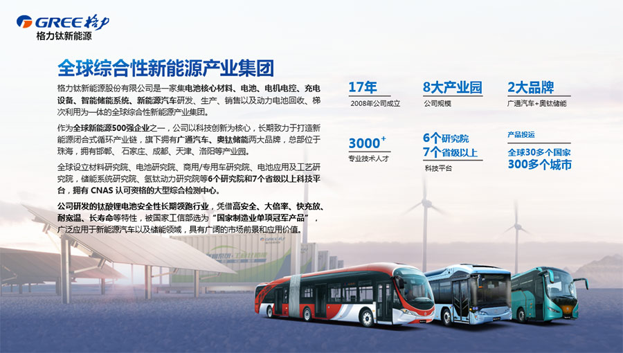 格力鈦新能源股份有限公司是一家集鋰電池核心材料、電池、電機(jī)電控、充電設(shè)備、智能儲(chǔ)能系統(tǒng)、新能源汽車研發(fā)、生產(chǎn)、銷售以及動(dòng)力電池回收梯次利用為一體的全球綜合性新能源產(chǎn)業(yè)集團(tuán)。格力鈦以科技創(chuàng)新為核心,打造新能源閉合式循環(huán)產(chǎn)業(yè)鏈,旗下?lián)碛袕V通汽車、奧鈦儲(chǔ)能兩大品牌,總部位于珠海,擁有邯鄲、石家莊、成都、天津、洛陽、南京等產(chǎn)業(yè)園。