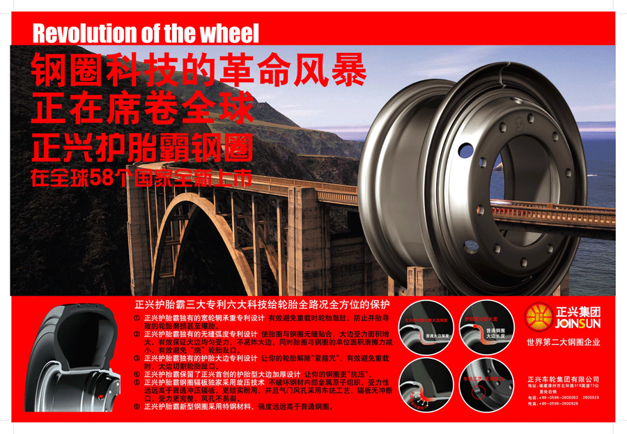 正興集團(tuán)在福建漳州(總部)、遼寧本溪、四川成都、河北廊坊、安徽合肥等地建有5家專業(yè)從事車輪制造的生產(chǎn)基地,產(chǎn)品以鋼制車輪為主,兼顧車橋、汽車螺栓等其它汽車零部件,市場(chǎng)營(yíng)銷網(wǎng)絡(luò)覆蓋全國(guó)各省、市、自治區(qū),擁有銷售網(wǎng)點(diǎn)4000余個(gè),并遠(yuǎn)銷韓國(guó)、日本、印度、美國(guó)、歐洲、非洲、中美洲等70多個(gè)國(guó)家和地區(qū),為國(guó)內(nèi)外100多家大、中型汽車廠配套。