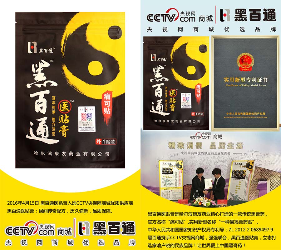 黑百通醫(yī)貼膏,每貼使用6-7天,持續(xù)使用168+小時(shí)。黑百通攜手CCTV央視網(wǎng)商城,強(qiáng)強(qiáng)聯(lián)合,立志打造家喻戶曉的民族品牌,讓世界愛上中國(guó)的黑膏藥!