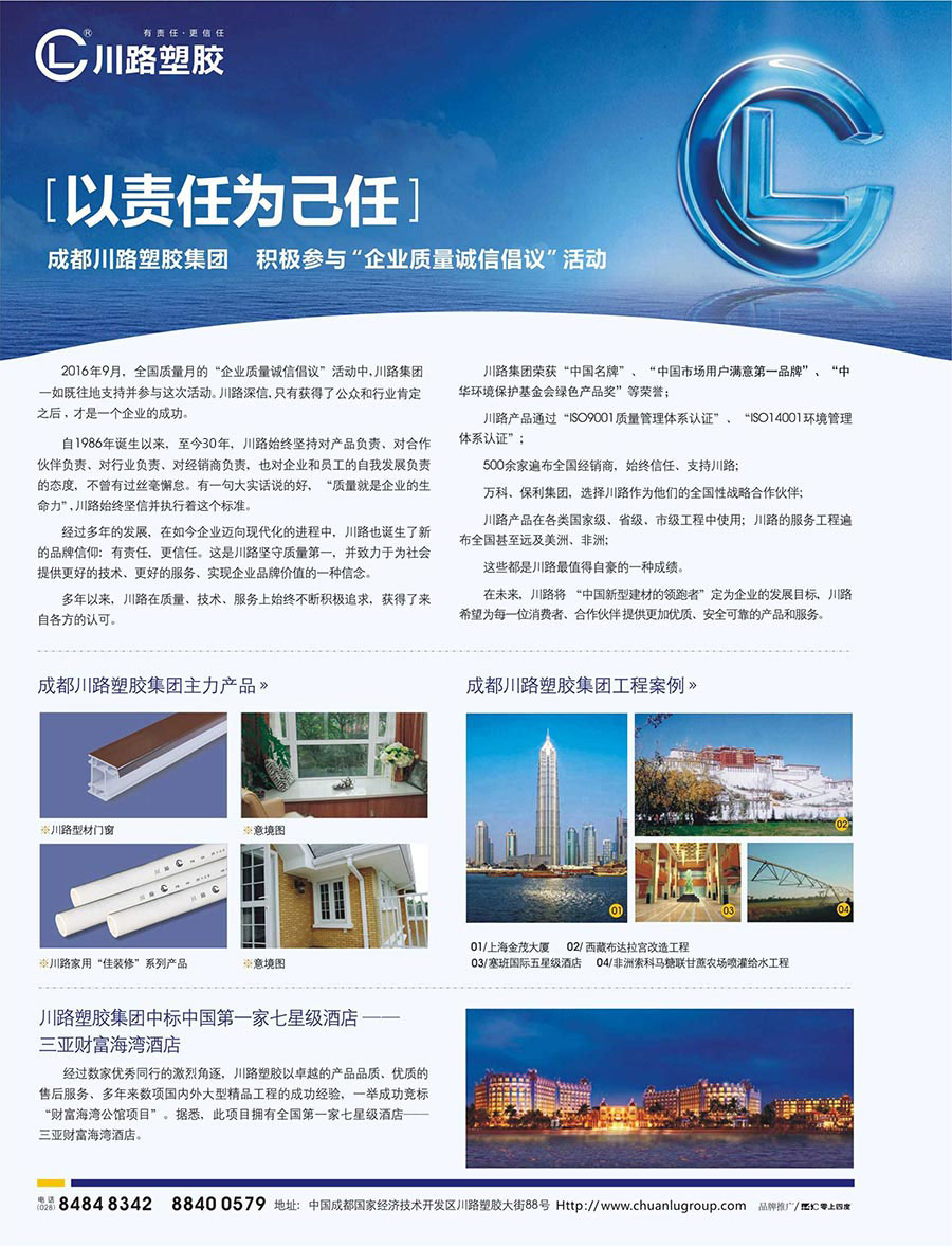 川路塑膠集團(tuán)是四川省高新技術(shù)企業(yè)和政府培育型大企業(yè),是中國塑料加工工業(yè)協(xié)會理事及管道分會副理事長單位和全國塑料制品標(biāo)準(zhǔn)化技術(shù)委員會委員兼SC3副主任委員單位。擁有國家授權(quán)的博士后科研工作站及數(shù)項國家產(chǎn)品專利,是四川大學(xué)高分子材料實驗基地,榮獲了中國名牌、中國環(huán)境標(biāo)志產(chǎn)品榮譽稱號,通過了ISO9001質(zhì)量管理體系認(rèn)證、ISO14001環(huán)境管理體系認(rèn)證、GB/T28001-2001職業(yè)健康管理體系等認(rèn)證,被評為中國市場用戶滿意第一品牌及中國管材管件業(yè)最具影響力品牌稱號。