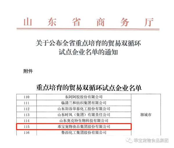 乖寶入選山東省重點培育的貿易雙循環(huán)試點企業(yè)