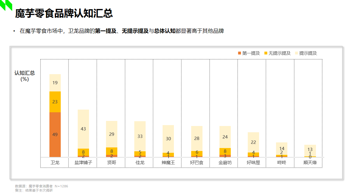 據(jù)2022年尼爾森調(diào)研顯示,在魔芋市場中,衛(wèi)龍品牌的第一提及、無提示提及與總體認(rèn)知都顯著高于其他品牌。顯然,衛(wèi)龍發(fā)明的魔芋爽在市場中已然奠定了良好且堅固的受眾認(rèn)知基礎(chǔ),那么“小魔女”的加入,不僅進一步充實了衛(wèi)龍自身的產(chǎn)品矩陣,占位了“魔芋素毛肚”的產(chǎn)品類目,也將引領(lǐng)魔芋休閑食品賽道邁向更高品質(zhì)的發(fā)展方向,為市場打開全新的增量機遇。