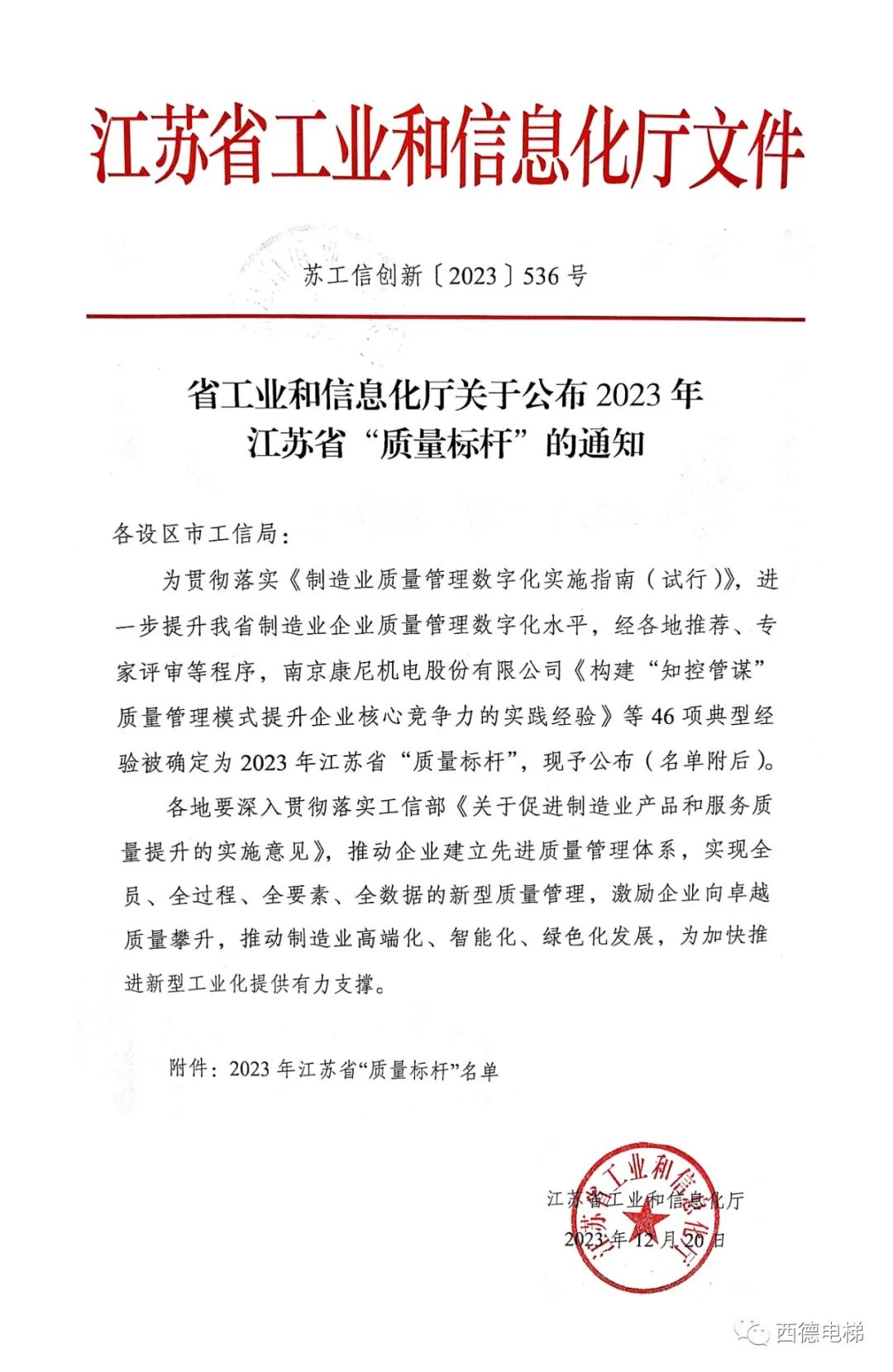 近日,江蘇省工業(yè)和信息化廳印發(fā)通知,發(fā)布2023年江蘇省“質量標桿”企業(yè)名單,江蘇西德電梯有限公司成功入圍,獲評2023年度江蘇省“質量標桿”企業(yè)!