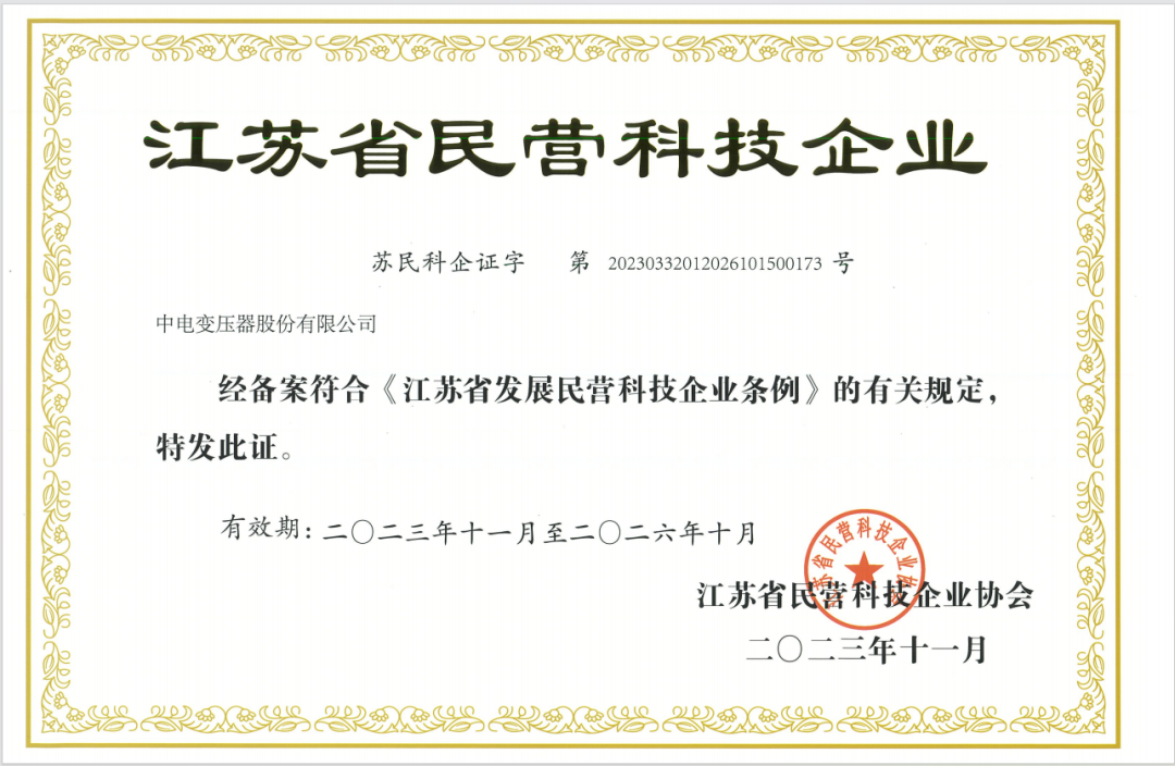 中電變壓器股份有限公司憑借突出的技術(shù)創(chuàng)新成績和強(qiáng)大實(shí)力榮列其中,榮獲“江蘇省民營科技企業(yè)”稱號!