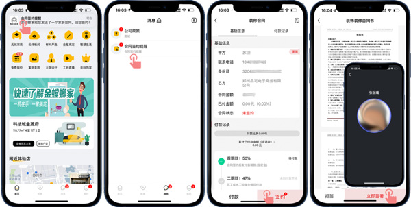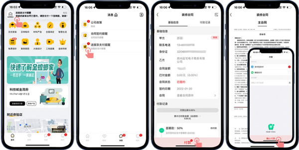 客戶線上確定好裝修門店后,門店會(huì)擬好線上合同,并推送到客戶的APP賬號(hào),客戶收到合同簽約提醒就可以在線簽約操作了,合同簽好后通過(guò)進(jìn)度款支付提醒可以進(jìn)行在線付款操作。