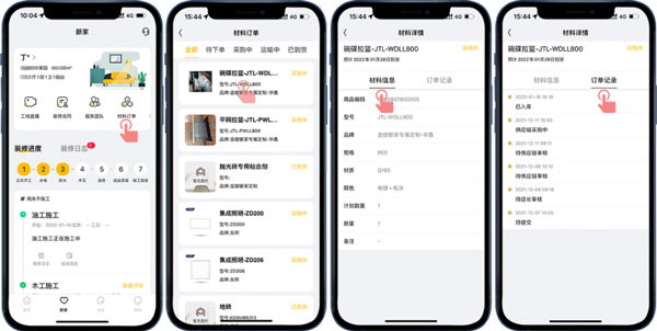 此外,也能在“新家-材料訂單”查看裝修涉及到的材料采購(gòu)和到貨情況,省去客戶去現(xiàn)場(chǎng)查看的麻煩,如果材料未按約定時(shí)間到貨,客戶也能及時(shí)跟催門店處理,以免耽誤裝修進(jìn)度。