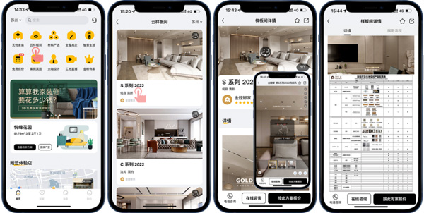 客戶想看整裝樣板間?不一定要去線下展館,一部手機(jī)就能逛夠癮。在金螳螂家APP“云樣板間”里,就可720云VR觀看各個(gè)空間的效果,里面可查看超詳細(xì)的空間材料配置表,都是優(yōu)質(zhì)大牌產(chǎn)品,還能隨時(shí)隨地針對(duì)產(chǎn)品進(jìn)行在線咨詢,并按照戶型預(yù)估樣板間設(shè)計(jì)報(bào)價(jià)。