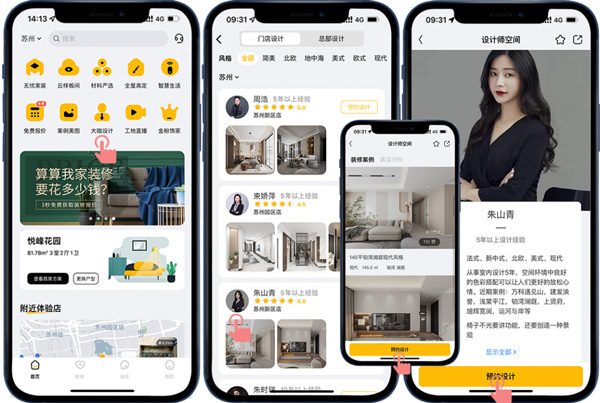 打開金螳螂家APP,進(jìn)入首頁(yè)“大咖設(shè)計(jì)”,可了解設(shè)計(jì)師的個(gè)人簡(jiǎn)介,以及他的優(yōu)秀裝修作品和客戶的真實(shí)評(píng)價(jià),通過(guò)以上了解,客戶挑選中意的設(shè)計(jì)師,馬上預(yù)約,就可與他線上直接暢聊溝通設(shè)計(jì)方案、設(shè)計(jì)細(xì)節(jié),為客戶量身定制專屬方案。