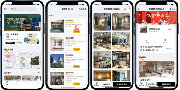 目前,金螳螂家在全國(guó)擁有150家門店,客戶可以通過(guò)“附近體驗(yàn)店”選擇客戶所在城市的服務(wù)門店,在這里可以了解到該門店的720度VR全景樣板間、案例、設(shè)計(jì)師以及客戶的真實(shí)評(píng)價(jià),不用出門探訪實(shí)體門店,就能快速了解門店情況,省時(shí)又省力!