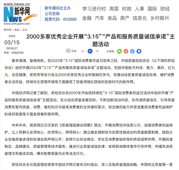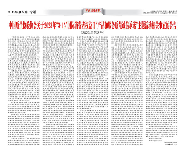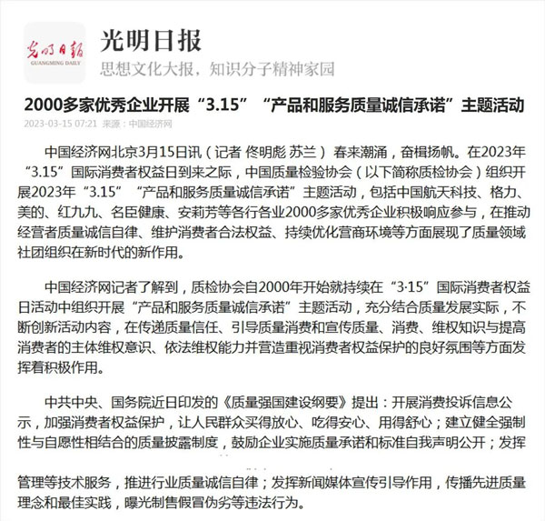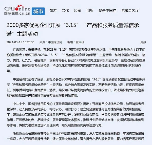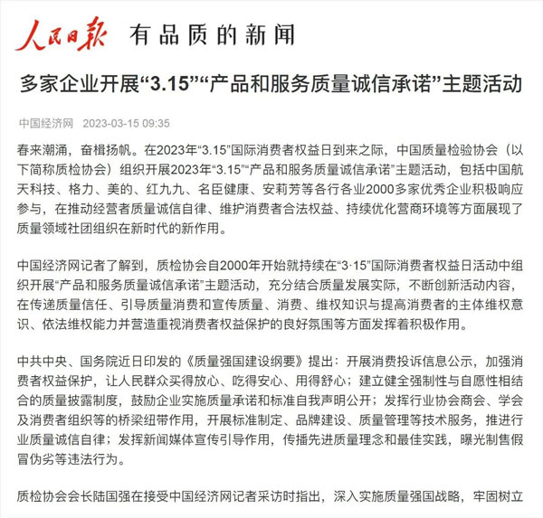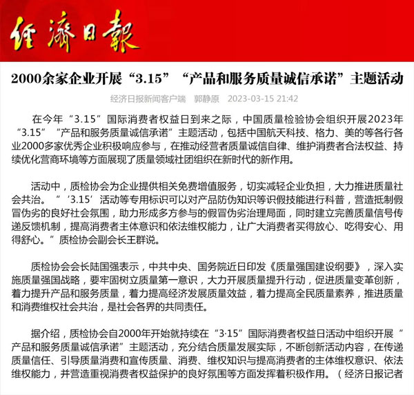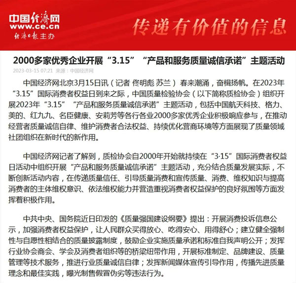 ——中國(guó)質(zhì)量檢驗(yàn)協(xié)會(huì)組織2000多家優(yōu)秀典范企業(yè)開(kāi)展“3.15”產(chǎn)品和服務(wù)質(zhì)量誠(chéng)信承諾活動(dòng)
