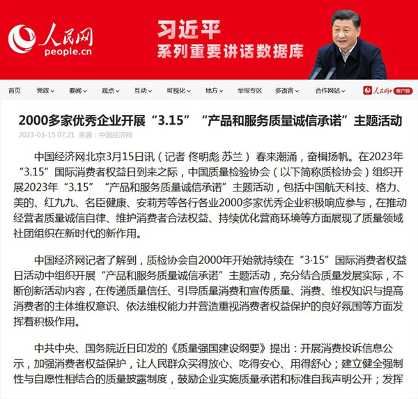 中國(guó)經(jīng)濟(jì)網(wǎng)北京3月16日訊 (記者 佟明彪 蘇蘭) 東風(fēng)浩蕩滿眼春,萬(wàn)里征途惟奮進(jìn)。全國(guó)兩會(huì)閉幕,高質(zhì)量發(fā)展嶄新啟航。在“3.15”國(guó)際消費(fèi)者權(quán)益日到來(lái)之際,中國(guó)質(zhì)量檢驗(yàn)協(xié)會(huì)(以下簡(jiǎn)稱質(zhì)檢協(xié)會(huì))組織開(kāi)展2023年“3.15”產(chǎn)品和服務(wù)質(zhì)量誠(chéng)信承諾主題活動(dòng),吸引了包括中國(guó)航天科技、格力、美的、紅九九、名臣健康、安莉芳等各行各業(yè)2000多家優(yōu)秀典范企業(yè)積極參與,在推動(dòng)經(jīng)營(yíng)者質(zhì)量誠(chéng)信自律,維護(hù)消費(fèi)者合法權(quán)益,持續(xù)優(yōu)化營(yíng)商環(huán)境等方面展現(xiàn)了質(zhì)量領(lǐng)域社團(tuán)組織在新時(shí)代的責(zé)任擔(dān)當(dāng)。