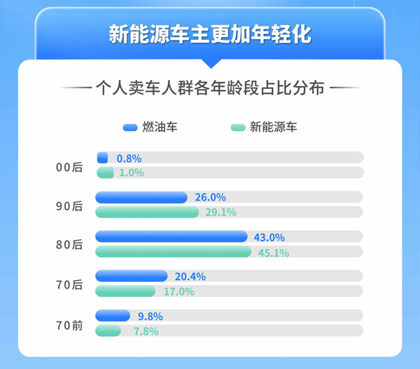 據(jù)天天拍車數(shù)據(jù)顯示,個人賣車車主年齡段分布占比,新能源車車主80后占比45.1%,90后占比29.1%,00后占比1.0%,對應(yīng)燃油車車主占比分別為43.0%,26.0%,0.8%。在越來越成熟的新能源汽車技術(shù)和促消費政策的加持下,新能源汽車保有量不斷增加,確保了二手車市場交易中新能源二手車車源充足,不少消費者在兼顧嘗“新”和性價比的心態(tài)下,選擇消費新能源二手車,不失為一個比較理性的消費心理。