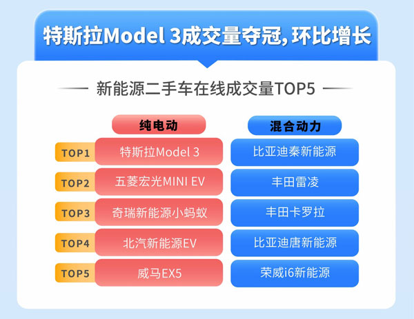 據(jù)天天拍車數(shù)據(jù)顯示,3月新能源二手車在線成交量排名,特斯拉Model 3奪得純電動新能源二手車成交量冠軍,環(huán)比2月成交量大增,其后依次是五菱宏光MINI EV、奇瑞新能源小螞蟻、北汽新能源EV、威馬EX5。比亞迪秦新能源二手車成交量占得混合動力新能源二手車成交量第一,其后依次是豐田雷凌、豐田卡羅拉、比亞迪唐新能源、榮威i6新能源。