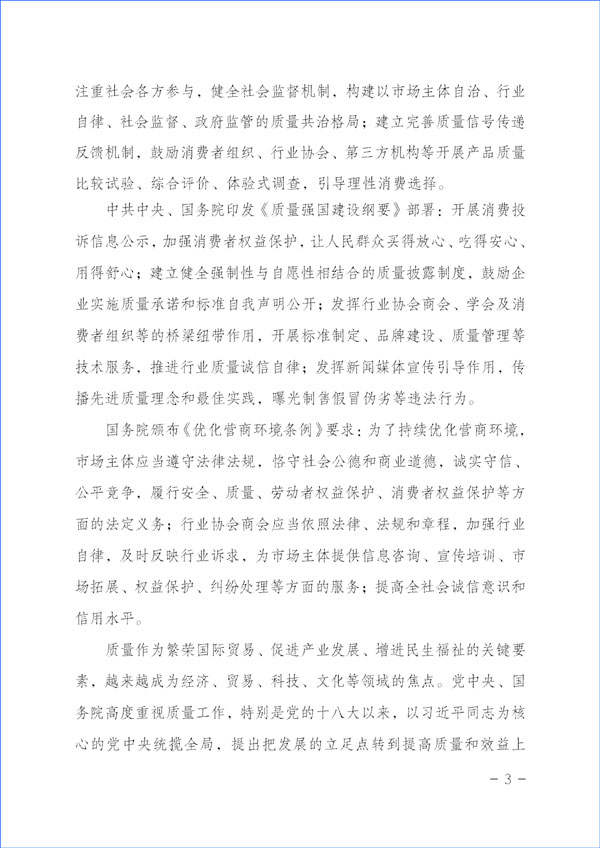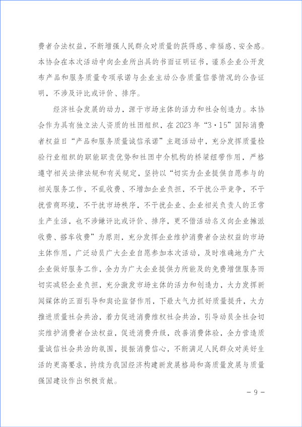 經(jīng)濟(jì)社會(huì)發(fā)展的動(dòng)力,源于市場(chǎng)主體的活力和社會(huì)創(chuàng)造力。本協(xié)會(huì)作為具有獨(dú)立法人資質(zhì)的社團(tuán)組織,在2023年“3·15”國(guó)際消費(fèi)者權(quán)益日“產(chǎn)品和服務(wù)質(zhì)量誠(chéng)信承諾”主題活動(dòng)中,充分發(fā)揮質(zhì)量檢驗(yàn)行業(yè)組織的職能職責(zé)優(yōu)勢(shì)和社團(tuán)中介機(jī)構(gòu)的橋梁紐帶作用,嚴(yán)格遵守相關(guān)法律法規(guī)和有關(guān)規(guī)定,堅(jiān)持以“切實(shí)為企業(yè)提供自愿參與的相關(guān)服務(wù)工作,不亂收費(fèi)、不增加企業(yè)負(fù)擔(dān),不干擾公平競(jìng)爭(zhēng),不干擾營(yíng)商環(huán)境,不干擾市場(chǎng)秩序,不干擾企業(yè)、企業(yè)相關(guān)負(fù)責(zé)人的正常生產(chǎn)生活,也不涉嫌評(píng)比或評(píng)價(jià)、排序,更不借活動(dòng)名義向企業(yè)攤派收費(fèi)、搭車收費(fèi)”為原則,充分發(fā)揮企業(yè)維護(hù)消費(fèi)者合法權(quán)益的市場(chǎng)主體作用,廣泛動(dòng)員廣大企業(yè)自愿參加本次活動(dòng),及時(shí)準(zhǔn)確地為廣大企業(yè)做好服務(wù)工作,全力為廣大企業(yè)提供力所能及的免費(fèi)增值服務(wù)而切實(shí)減輕企業(yè)負(fù)擔(dān),充分激發(fā)市場(chǎng)主體的活力和創(chuàng)造力,大力發(fā)揮新聞媒體的正面引導(dǎo)和輿論監(jiān)督作用,下最大氣力抓好質(zhì)量提升,大力推進(jìn)質(zhì)量社會(huì)共治,著力促進(jìn)消費(fèi)維權(quán)社會(huì)共治,引導(dǎo)動(dòng)員全社會(huì)切實(shí)維護(hù)消費(fèi)者合法權(quán)益,促進(jìn)消費(fèi)升級(jí),改善消費(fèi)體驗(yàn),全力營(yíng)造質(zhì)量誠(chéng)信社會(huì)共治的氛圍,提振消費(fèi)信心,不斷滿足人民群眾對(duì)美好生活的更高要求,持續(xù)為我國(guó)經(jīng)濟(jì)構(gòu)建新發(fā)展格局和高質(zhì)量發(fā)展與質(zhì)量強(qiáng)國(guó)建設(shè)作出積極貢獻(xiàn)。