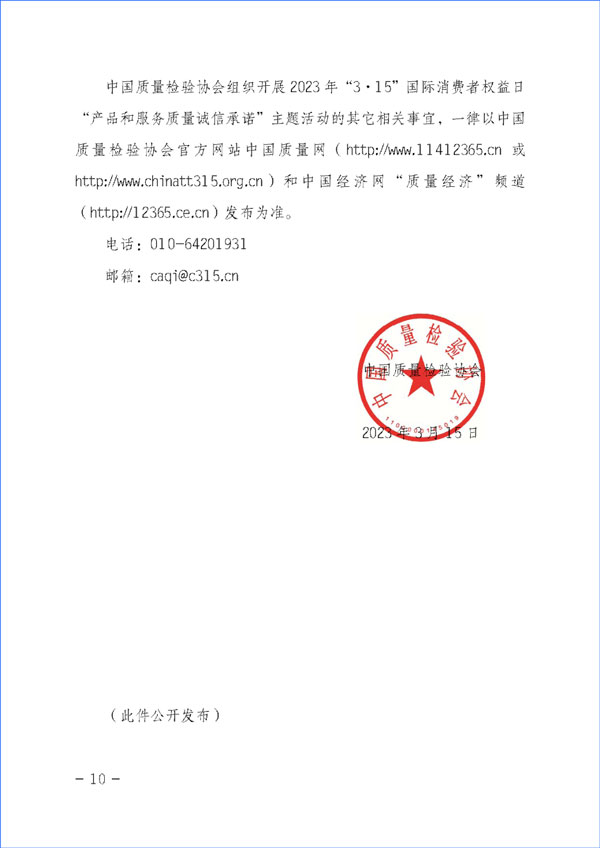 中國(guó)質(zhì)量檢驗(yàn)協(xié)會(huì)組織開展2023年“3·15”國(guó)際消費(fèi)者權(quán)益日“產(chǎn)品和服務(wù)質(zhì)量誠(chéng)信承諾”主題活動(dòng)的其它相關(guān)事宜,一律以中國(guó)質(zhì)量檢驗(yàn)協(xié)會(huì)官方網(wǎng)站中國(guó)質(zhì)量網(wǎng)(http://www.11412365.cn或http://www.chinatt315.org.cn)和中國(guó)經(jīng)濟(jì)網(wǎng)“質(zhì)量經(jīng)濟(jì)”頻道(http://12365.ce.cn)發(fā)布為準(zhǔn)。
