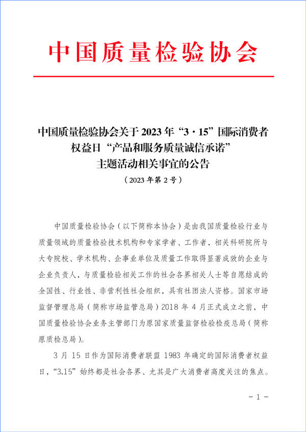 中國(guó)質(zhì)量檢驗(yàn)協(xié)會(huì)關(guān)于組織開展2023年“3·15”活動(dòng)的公告