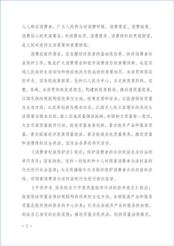消費(fèi)是最終需求,是支撐經(jīng)濟(jì)發(fā)展的基礎(chǔ)性因素。做好消費(fèi)者權(quán)益保護(hù)工作,既是擴(kuò)大消費(fèi)需求和提升消費(fèi)潛力的重要保障,也是實(shí)現(xiàn)人民美好生活向往和檢驗(yàn)執(zhí)政為民成效的重要標(biāo)尺。全面貫徹落實(shí)黨中央、國(guó)務(wù)院決策部署,堅(jiān)持以人民為中心,立足新發(fā)展階段,完整、準(zhǔn)確、全面貫徹新發(fā)展理念,構(gòu)建新發(fā)展格局,推動(dòng)高質(zhì)量發(fā)展,以深化供給側(cè)結(jié)構(gòu)性改革為主線,統(tǒng)籌發(fā)展和安全,以提高供給質(zhì)量為主攻方向,以改革創(chuàng)新為根本動(dòng)力,以滿足人民日益增長(zhǎng)的美好生活需要為根本目的,深入實(shí)施質(zhì)量強(qiáng)國(guó)戰(zhàn)略,牢固樹立質(zhì)量第一意識(shí),大力開展質(zhì)量提升行動(dòng),促進(jìn)質(zhì)量變革創(chuàng)新,著力提升產(chǎn)品和服務(wù)質(zhì)量,著力提高經(jīng)濟(jì)發(fā)展質(zhì)量效益,著力提高全民質(zhì)量素養(yǎng),推進(jìn)質(zhì)量和消費(fèi)維權(quán)社會(huì)共治,是社會(huì)各界的共同責(zé)任。