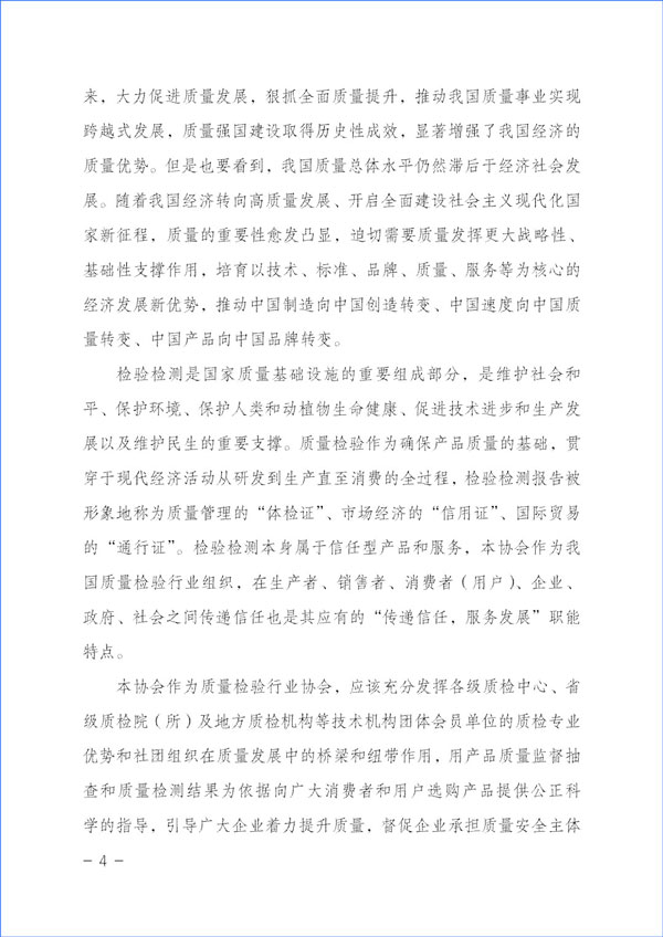 本協(xié)會(huì)作為質(zhì)量檢驗(yàn)行業(yè)協(xié)會(huì),應(yīng)該充分發(fā)揮各級(jí)質(zhì)檢中心、省級(jí)質(zhì)檢院(所)及地方質(zhì)檢機(jī)構(gòu)等技術(shù)機(jī)構(gòu)團(tuán)體會(huì)員單位的質(zhì)檢專業(yè)優(yōu)勢(shì)和社團(tuán)組織在質(zhì)量發(fā)展中的橋梁和紐帶作用,用產(chǎn)品質(zhì)量監(jiān)督抽查和質(zhì)量檢測(cè)結(jié)果為依據(jù)向廣大消費(fèi)者和用戶選購(gòu)產(chǎn)品提供公正科學(xué)的指導(dǎo),引導(dǎo)廣大企業(yè)著力提升質(zhì)量,督促企業(yè)承擔(dān)質(zhì)量安全主體作用,倡導(dǎo)企業(yè)自覺履行社會(huì)責(zé)任,并切實(shí)運(yùn)用輿論宣傳作用,向全社會(huì)提供公正可靠的質(zhì)量信息和消費(fèi)信息,傳遞質(zhì)量信任,引導(dǎo)質(zhì)量消費(fèi),有效幫助消費(fèi)者選擇高標(biāo)準(zhǔn)高質(zhì)量產(chǎn)品,助力質(zhì)量供給側(cè)結(jié)構(gòu)性改革,抓好質(zhì)量提升,推進(jìn)質(zhì)量強(qiáng)國(guó)建設(shè)。