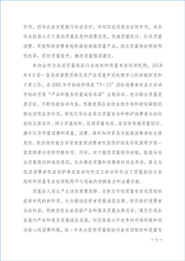 本協(xié)會(huì)作為全國(guó)質(zhì)量檢驗(yàn)行業(yè)組織和質(zhì)量專業(yè)社團(tuán)機(jī)構(gòu),2018年4月前一直承擔(dān)著原質(zhì)檢總局產(chǎn)品質(zhì)量申訴處理中心的職能職責(zé)和日常工作,自2000年開始就持續(xù)在“3·15”國(guó)際消費(fèi)者權(quán)益日活動(dòng)中組織開展“產(chǎn)品和服務(wù)質(zhì)量誠(chéng)信承諾”主題活動(dòng),充分結(jié)合質(zhì)量發(fā)展實(shí)際,不斷創(chuàng)新活動(dòng)內(nèi)容,積極發(fā)揮企業(yè)的主體作用和新聞媒體的輿論宣傳監(jiān)督作用,督促引導(dǎo)企業(yè)落實(shí)質(zhì)量安全和維護(hù)消費(fèi)者合法權(quán)益的主體責(zé)任,樹立質(zhì)量標(biāo)桿,弘揚(yáng)質(zhì)量先進(jìn),在宣傳傳遞質(zhì)量信任、推介引導(dǎo)質(zhì)量消費(fèi)和質(zhì)量、消費(fèi)、維權(quán)知識(shí)普及與提高消費(fèi)者的主體意識(shí)、依法維權(quán)能力并營(yíng)造重視消費(fèi)者權(quán)益保護(hù)的良好氛圍等方面一直發(fā)揮著應(yīng)有的積極作用。同時(shí),對(duì)于激發(fā)質(zhì)量提升動(dòng)能,提高全社會(huì)質(zhì)量意識(shí)和誠(chéng)信意識(shí),合力推進(jìn)質(zhì)量和消費(fèi)維權(quán)社會(huì)共治,著力為我國(guó)消費(fèi)者權(quán)益保護(hù)事業(yè)在新時(shí)代邁上新臺(tái)階作出了質(zhì)量檢驗(yàn)行業(yè)組織和質(zhì)量專業(yè)社團(tuán)機(jī)構(gòu)不可或缺的積極努力和必要貢獻(xiàn)。