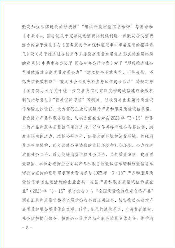 為貫徹落實(shí)《中共中央關(guān)于堅(jiān)持和完善中國(guó)特色社會(huì)主義制度 推進(jìn)國(guó)家治理體系和治理能力現(xiàn)代化若干重大問(wèn)題的決定》對(duì)于“強(qiáng)化消費(fèi)者權(quán)益保護(hù)”的重要精神和《中共中央 國(guó)務(wù)院關(guān)于開展質(zhì)量提升行動(dòng)的指導(dǎo)意見》與《質(zhì)量強(qiáng)國(guó)建設(shè)綱要》對(duì)于“推廣實(shí)施優(yōu)質(zhì)服務(wù)承諾標(biāo)識(shí)和管理制度,培育知名服務(wù)品牌,全面實(shí)施企業(yè)標(biāo)準(zhǔn)自我聲明公開和監(jiān)督制度”等重要部署及《國(guó)務(wù)院關(guān)于建立完善守信聯(lián)合激勵(lì)和失信聯(lián)合懲戒制度加快推進(jìn)社會(huì)誠(chéng)信建設(shè)的指導(dǎo)意見》對(duì)于“健全褒揚(yáng)和激勵(lì)誠(chéng)信行為機(jī)制”“多渠道選樹誠(chéng)信典型”“引導(dǎo)企業(yè)主動(dòng)發(fā)布綜合信用承諾或產(chǎn)品和服務(wù)質(zhì)量等專項(xiàng)承諾”及《建設(shè)高標(biāo)準(zhǔn)市場(chǎng)體系行動(dòng)方案》(中共中央辦公廳、國(guó)務(wù)院辦公廳印發(fā))關(guān)于“健全社會(huì)監(jiān)督”和《國(guó)務(wù)院辦公廳關(guān)于開展消費(fèi)品工業(yè)“三品”專項(xiàng)行動(dòng)營(yíng)造良好市場(chǎng)環(huán)境的若干意見》有關(guān)“加強(qiáng)輿論引導(dǎo),地方各級(jí)政府和行業(yè)協(xié)會(huì)要表彰和宣傳品牌建設(shè)成就突出的企業(yè)和企業(yè)家,激發(fā)加強(qiáng)品牌建設(shè)的積極性”“組織開展質(zhì)量信譽(yù)承諾”等要求和《中共中央 國(guó)務(wù)院關(guān)于完善促進(jìn)消費(fèi)體制機(jī)制進(jìn)一步激發(fā)居民消費(fèi)潛力的若干意見》與《國(guó)務(wù)院關(guān)于加強(qiáng)和規(guī)范事中事后監(jiān)管的指導(dǎo)意見》及《關(guān)于推進(jìn)社會(huì)信用體系建設(shè)高質(zhì)量發(fā)展促進(jìn)形成新發(fā)展格局的意見》(中共中央辦公廳 國(guó)務(wù)院辦公廳印發(fā))對(duì)于“形成推進(jìn)社會(huì)信用體系建設(shè)高質(zhì)量發(fā)展合力”“建立健全不敢失信、不能失信、不想失信長(zhǎng)效機(jī)制”“鼓勵(lì)社會(huì)公眾積極參與誠(chéng)信建設(shè)活動(dòng)”等規(guī)定與《國(guó)務(wù)院辦公廳關(guān)于進(jìn)一步完善失信約束制度構(gòu)建誠(chéng)信建設(shè)長(zhǎng)效機(jī)制的指導(dǎo)意見》“倡導(dǎo)誠(chéng)實(shí)守信”等精神,積極引導(dǎo)企業(yè)履行質(zhì)量誠(chéng)信承諾主體責(zé)任,大力督促企業(yè)切實(shí)履行產(chǎn)品和服務(wù)質(zhì)量誠(chéng)信承諾,著力提升產(chǎn)品和服務(wù)質(zhì)量,切實(shí)方便企業(yè)對(duì)在2023年“3·15”所作出的產(chǎn)品和服務(wù)質(zhì)量誠(chéng)信承諾進(jìn)行廣泛宣傳并接受社會(huì)各界監(jiān)督,激發(fā)市場(chǎng)主體活力,維護(hù)公平競(jìng)爭(zhēng),優(yōu)化營(yíng)商環(huán)境和消費(fèi)環(huán)境,加強(qiáng)消費(fèi)者權(quán)益保護(hù),助力營(yíng)造公平誠(chéng)信的市場(chǎng)環(huán)境和社會(huì)環(huán)境,合力推進(jìn)質(zhì)量社會(huì)共治,著力促進(jìn)消費(fèi)維權(quán)社會(huì)共治,共筑質(zhì)量誠(chéng)信,建設(shè)質(zhì)量強(qiáng)國(guó),本協(xié)會(huì)根據(jù)企業(yè)對(duì)其產(chǎn)品和服務(wù)質(zhì)量誠(chéng)信承諾和質(zhì)量信譽(yù)承諾公告宣傳的證明需求而免費(fèi)向參與2023年“3·15”產(chǎn)品和服務(wù)質(zhì)量誠(chéng)信承諾主題活動(dòng)的企業(yè)出具“全國(guó)產(chǎn)品和服務(wù)質(zhì)量誠(chéng)信示范企業(yè)”(2023年“3·15”承諾公告)與“全國(guó)質(zhì)量檢驗(yàn)穩(wěn)定合格產(chǎn)品”調(diào)查匯總和質(zhì)量信譽(yù)承諾展示公告書面證明證書,切實(shí)推動(dòng)企業(yè)對(duì)產(chǎn)品質(zhì)量和服務(wù)質(zhì)量作出客觀、科學(xué)、規(guī)范的誠(chéng)信承諾,為消費(fèi)者維權(quán)、社會(huì)監(jiān)督提供依據(jù),督促企業(yè)落實(shí)產(chǎn)品和服務(wù)質(zhì)量主體責(zé)任,維護(hù)消費(fèi)者合法權(quán)益,不斷增強(qiáng)人民群眾對(duì)質(zhì)量的獲得感、幸福感、安全感。本協(xié)會(huì)在本次活動(dòng)中向企業(yè)所出具的書面證明證書,謹(jǐn)系企業(yè)公開發(fā)布產(chǎn)品和服務(wù)質(zhì)量專項(xiàng)承諾與企業(yè)主動(dòng)公告質(zhì)量信譽(yù)情況的公告證明,不涉及評(píng)比或評(píng)價(jià)、排序。