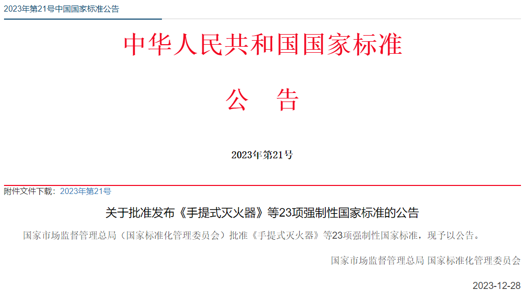 近日,2023年第21號(hào)國家標(biāo)準(zhǔn)公告發(fā)布,國家市場(chǎng)監(jiān)督管理總局(國家標(biāo)準(zhǔn)化管理委員會(huì))批準(zhǔn)發(fā)布《手提式滅火器》等23項(xiàng)強(qiáng)制性國家標(biāo)準(zhǔn),詳情如下: