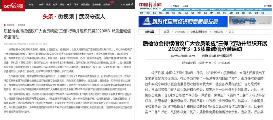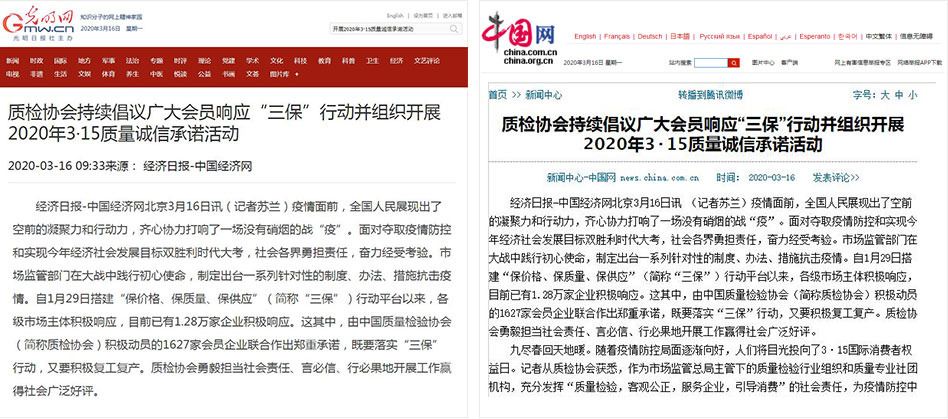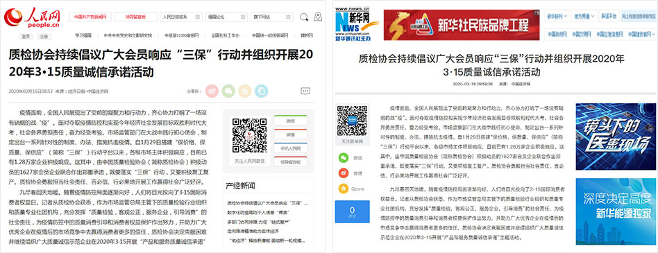 人民網(wǎng)《質(zhì)檢協(xié)會(huì)持續(xù)倡議廣大會(huì)員響應(yīng)“三保”行動(dòng)并組織開展2020年3·15質(zhì)量誠(chéng)信承諾活動(dòng)》
