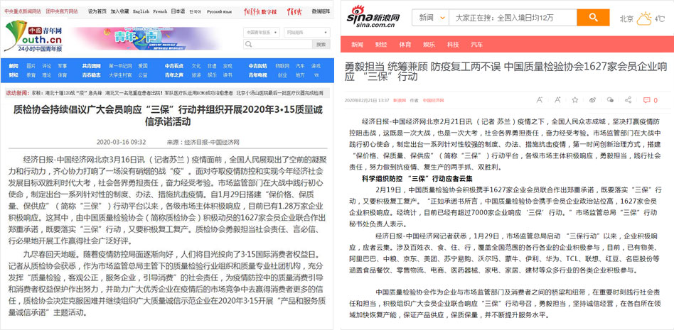 中國(guó)青年網(wǎng)《質(zhì)檢協(xié)會(huì)持續(xù)倡議廣大會(huì)員響應(yīng)“三保”行動(dòng)并組織開展2020年3·15質(zhì)量誠(chéng)信承諾活動(dòng)》