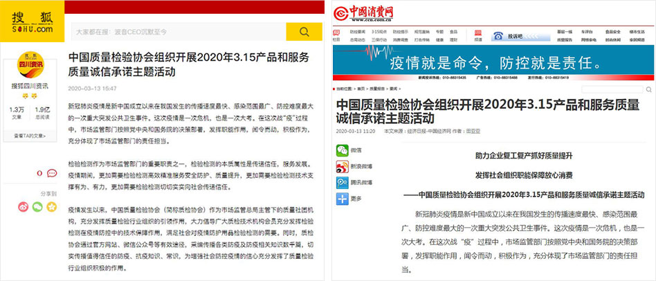 搜狐網(wǎng)《中國(guó)質(zhì)量檢驗(yàn)協(xié)會(huì)組織開展2020年3.15產(chǎn)品和服務(wù)質(zhì)量誠(chéng)信承諾主題活動(dòng)》