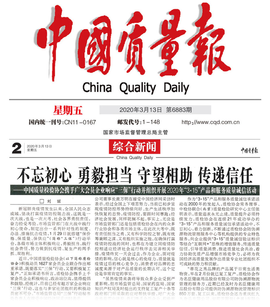 中國(guó)質(zhì)量報(bào)《不忘初心 勇毅擔(dān)當(dāng) 守望相助 傳遞信任——中國(guó)質(zhì)量檢驗(yàn)協(xié)會(huì)攜手廣大會(huì)員企業(yè)響應(yīng)“三保”行動(dòng)并組織開展2020年“3·15”產(chǎn)品和服務(wù)質(zhì)量誠(chéng)信活動(dòng)》